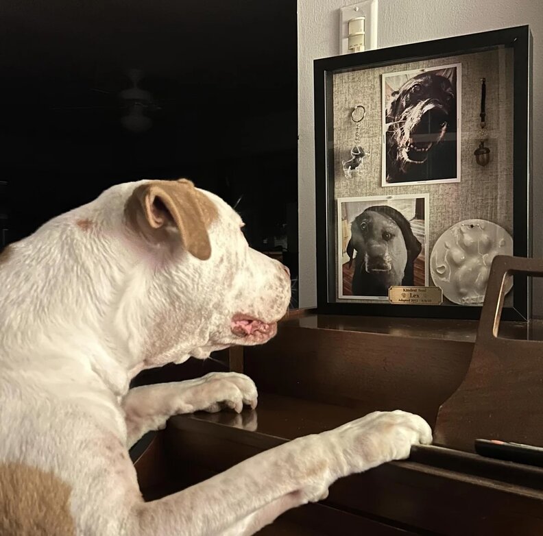 To honor Lex, Spiro created a memorial — a small shadowbox holding her paw print, a lock of fur, her ashes, and a few cherished photos. He placed it on top of the piano in the living room, where the light could gently fall on it each day.