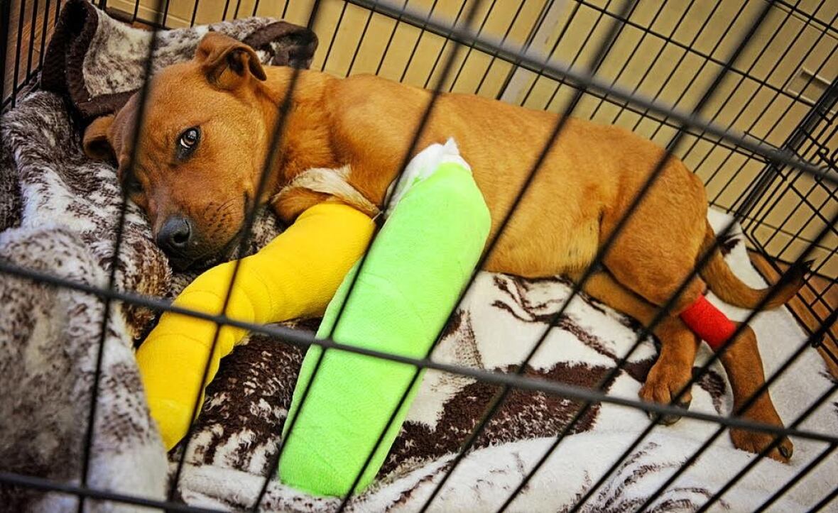 Veterinarians believe the puppy — named Panzer — was attacked by a wild animal. His right elbow was fractured, his left ulna shattered, and he was suffering from sepsis and severe anemia. After surgery, Panzer is now recovering in a foster home — one of more than 500 animals AARCS is currently caring for.
