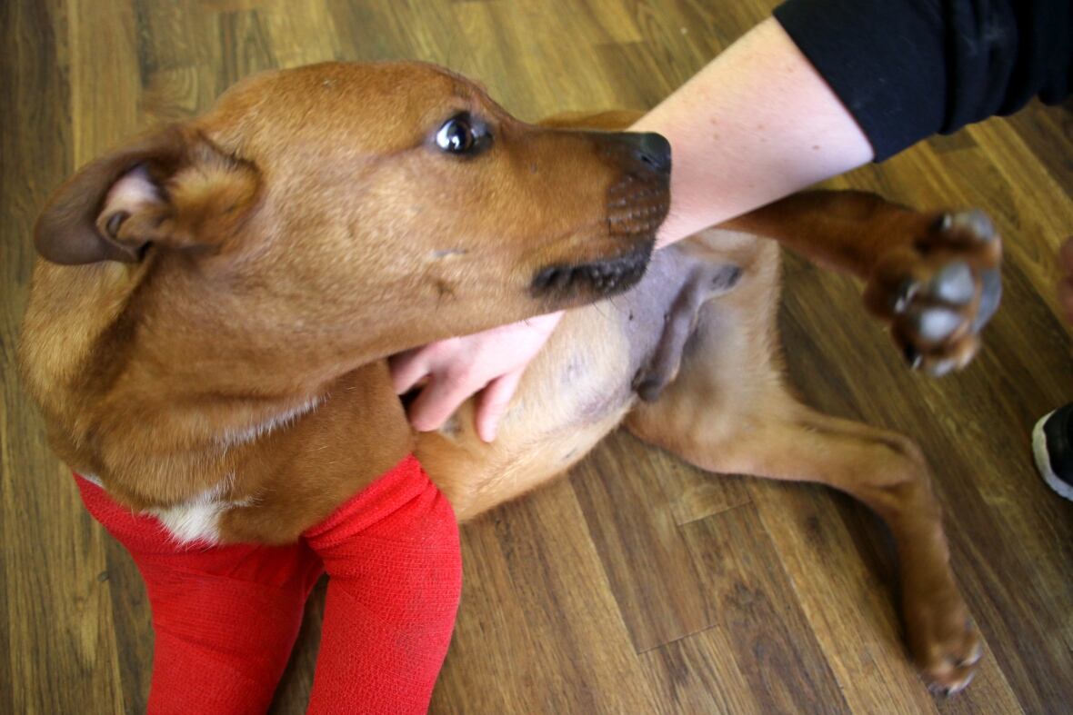 Late last month, AARCS members were called to a rural area near Rocky Mountain House, where they found a four-month-old mixed-breed puppy lying in a ditch with two broken front legs.