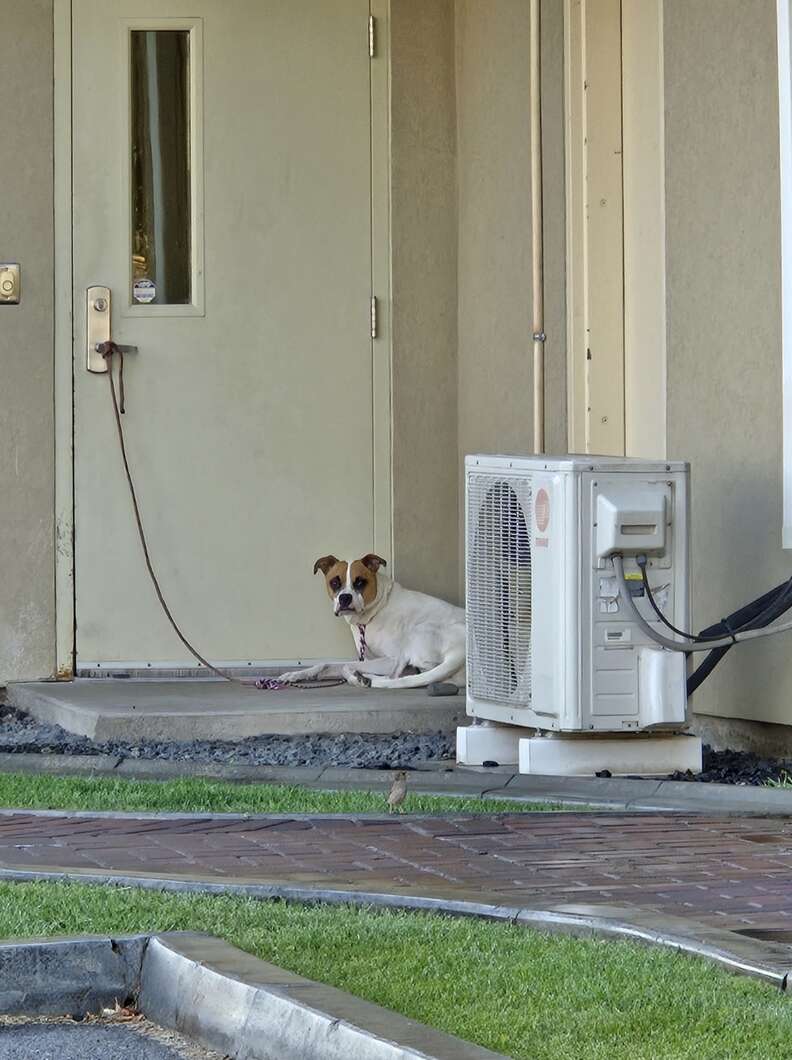 A small dog was tied to the back door. She lay quietly beside the air conditioning unit, her eyes full of confusion and sadness, as if she had been waiting for hours for someone — anyone — to notice her.