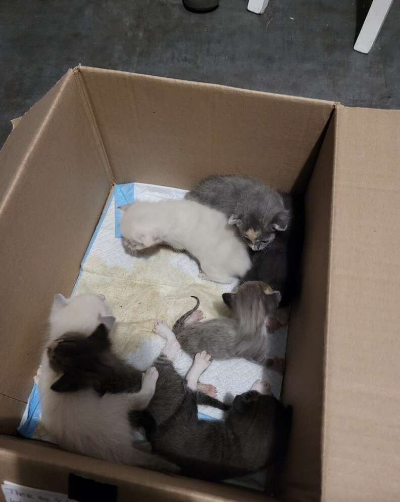 She opened the box — and her heart broke again. One tiny kitten had already passed away. The seven survivors were huddled together, confused and hungry.