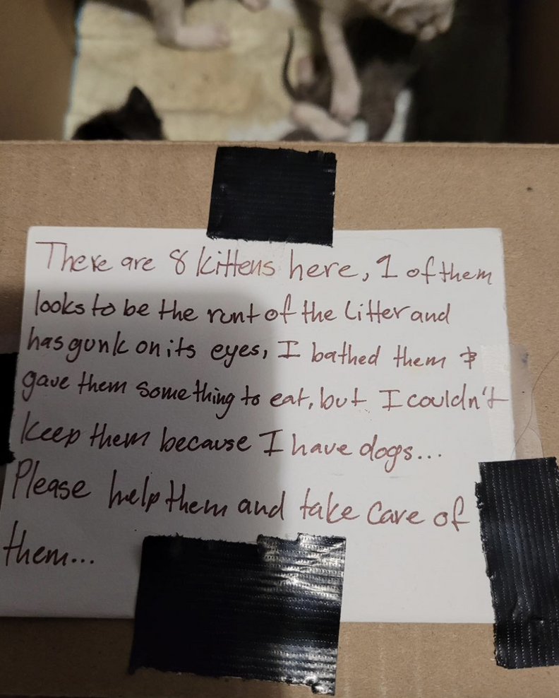 Trusting her instincts, she stepped out to look around — and that’s when she saw it: a taped-up cardboard box on the ground beside her passenger door. On top was a note explaining that someone had found a litter of kittens but couldn’t keep them because they had dogs.