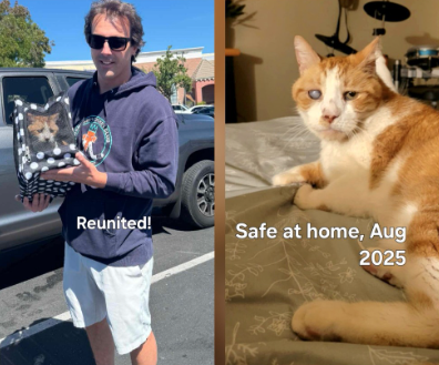In mid-August 2025, Bird drove Bayou several hours north for the reunion. When his dad saw him, the years melted away. Bayou purred, cuddled, and settled in as if he’d never been gone.