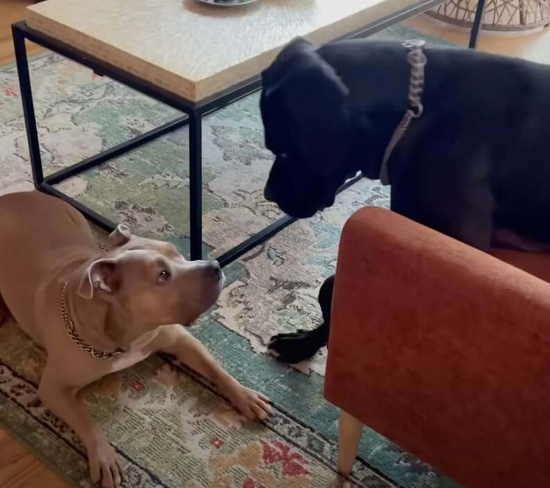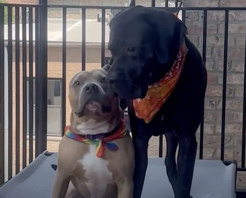 In time, Ralphie began to play with toys and enjoy small moments of joy. Burns cautiously introduced him to her dog, Winnie, starting with crate time and calm rewards. Gradually, Ralphie became more comfortable — walking alongside Winnie, resting in the same room, and eventually, one sunny day on the balcony, playing together for the first time.