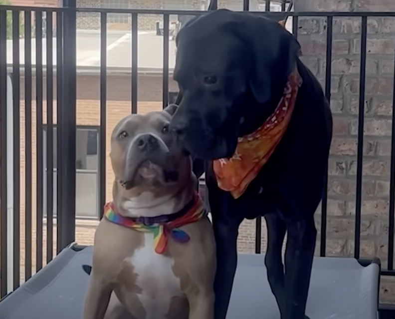 In time, Ralphie began to play with toys and enjoy small moments of joy. Burns cautiously introduced him to her dog, Winnie, starting with crate time and calm rewards. Gradually, Ralphie became more comfortable — walking alongside Winnie, resting in the same room, and eventually, one sunny day on the balcony, playing together for the first time.