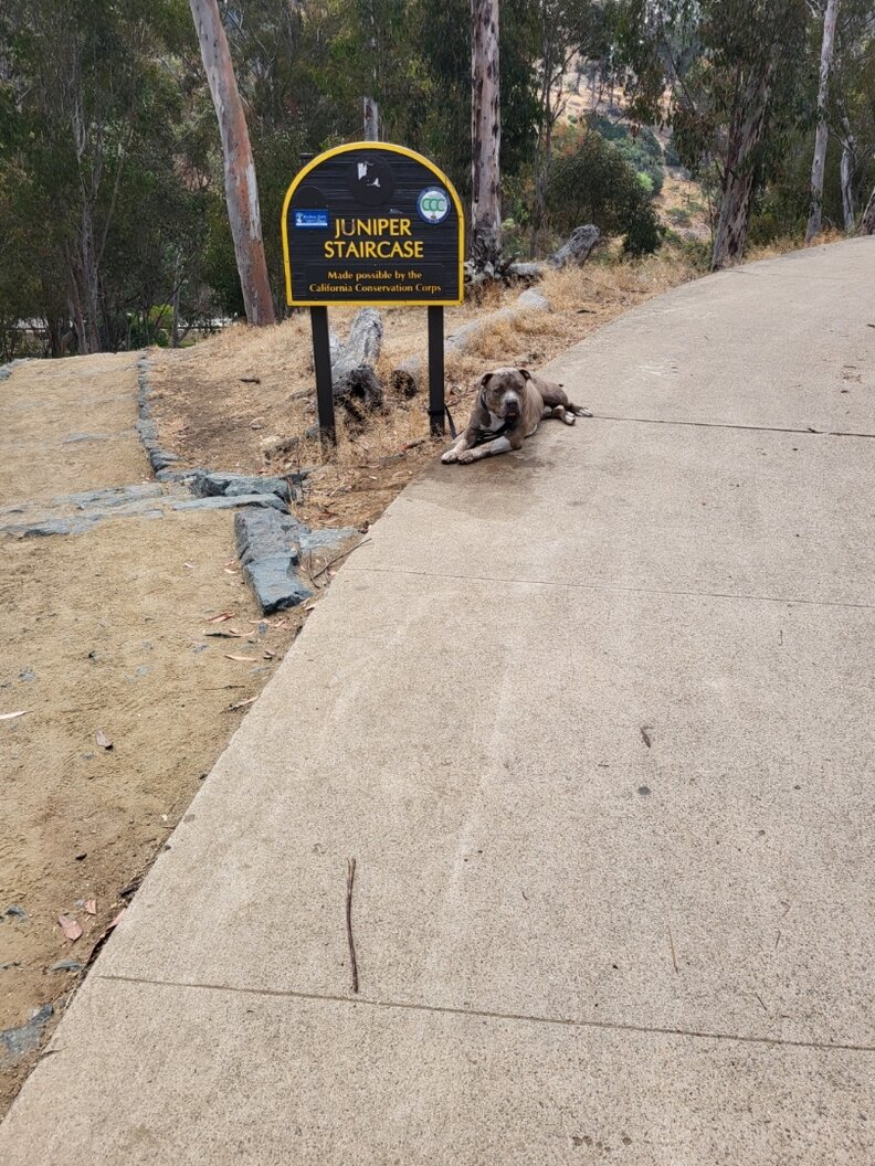 Her neighbor had been walking through Balboa Park when he spotted a gray pit bull tied to a fence near a section known as Juniper’s Staircase. Knowing that Erica often rescues dogs — especially pit bulls — he called her for help.