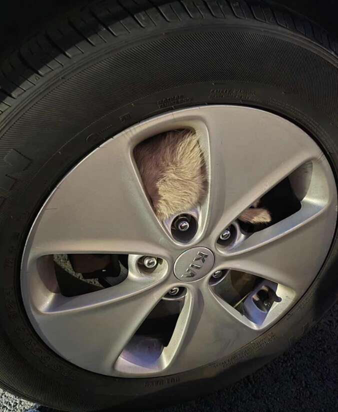 The kitten bolted under her car — and vanished. Just when she thought she’d lost him, a faint meow came from one of her wheels. To her shock, the kitten had wedged himself between the hubcap and the tire, tiny tufts of fur sticking out.