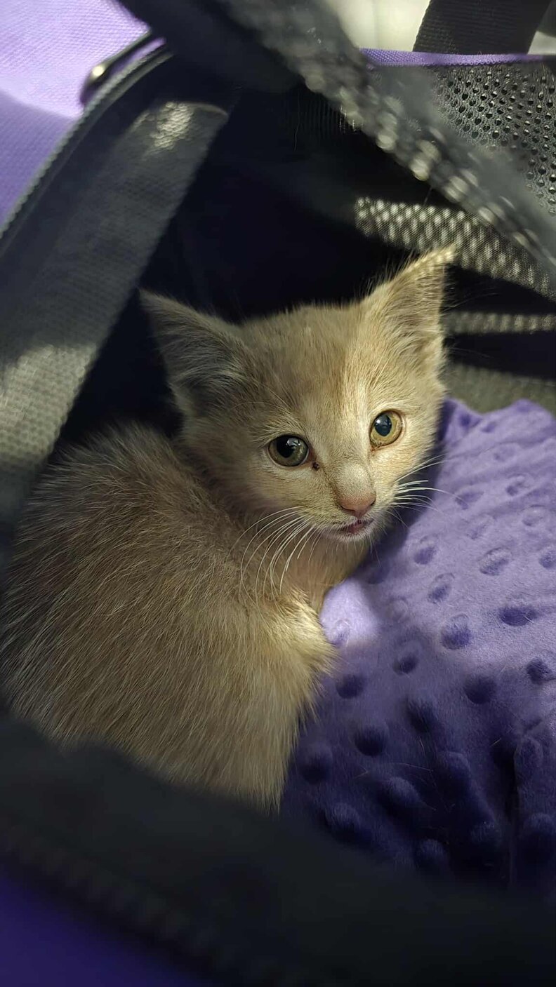 Too late to bring him to a shelter, Bartuszek took him home, gave him food and water, and let him rest in a quiet room. By morning, the kitten was calmer but still wary of human touch. She reached out to local rescues for help.