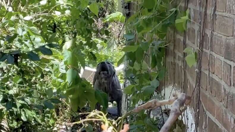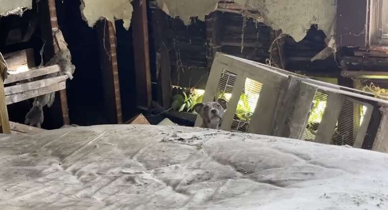 A gray pit bull stood defiantly in the yard, her watchful eyes locked on Donna and her colleague Natalie Thomson, barking sharply as they drew closer. According to SRSL’s Facebook post, this “mama dog” was fiercely guarding her puppies hidden inside the crumbling home.