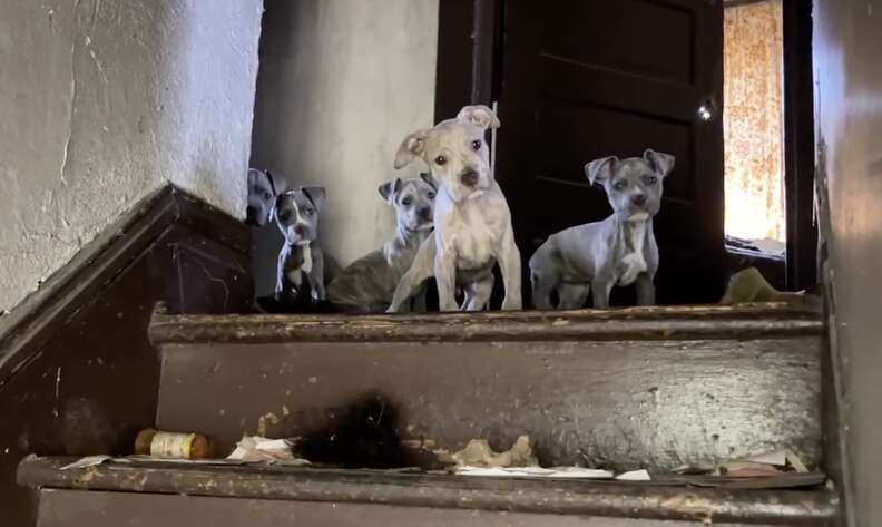 They carefully stepped through the ground floor and up a staircase littered with discarded lottery tickets. At the top, a cluster of curious puppies peeked at them, tilting their little heads. But as soon as the rescuers stepped forward, the pups scattered into a dilapidated room, hiding in the tightest spaces they could find.